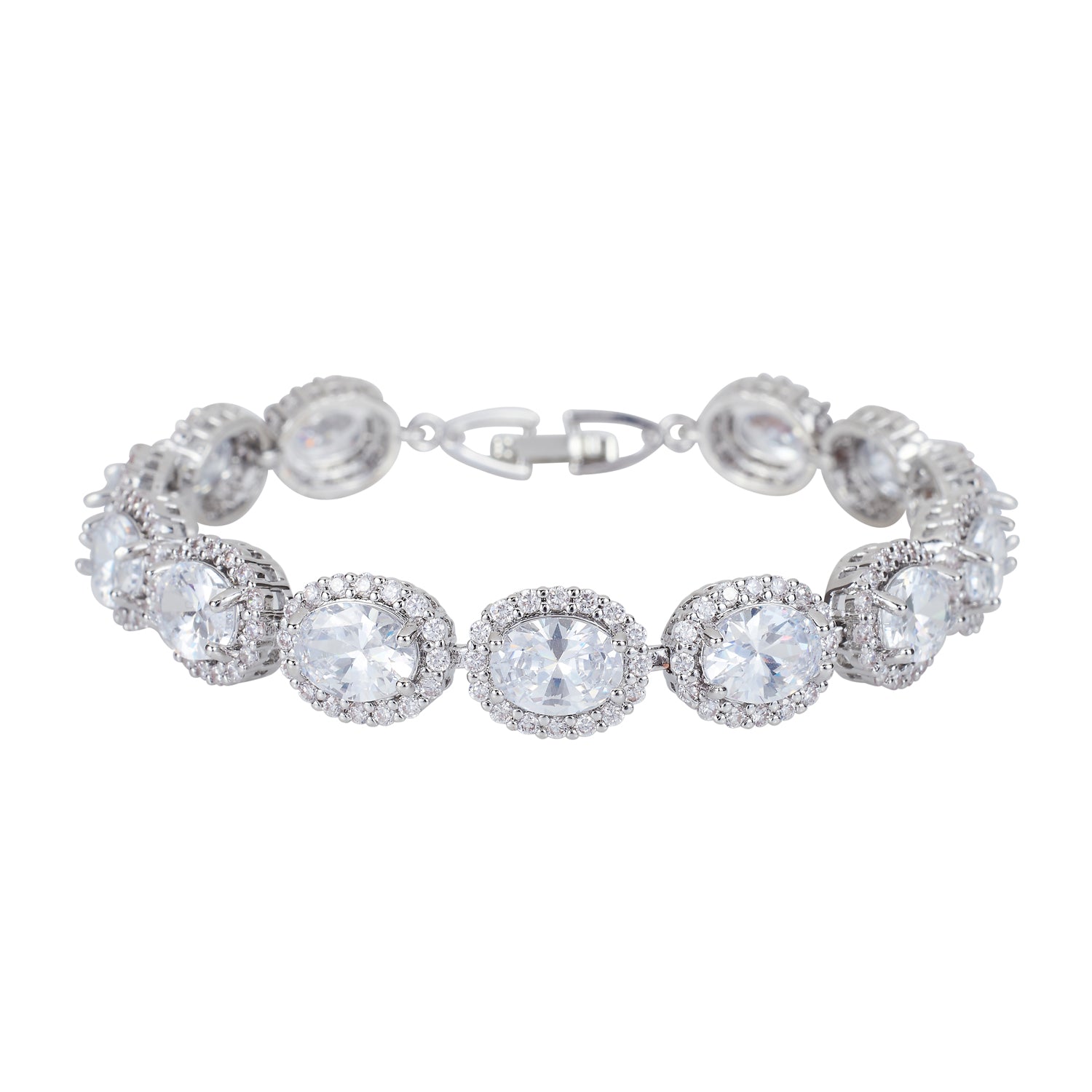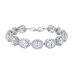 A unique oval shape cubic zirconia with brilliant pave stones. The sparkle and shine is quite spectacular. This bracelet is a show stopper and will make a beautiful statement for your wedding or any special occasion