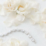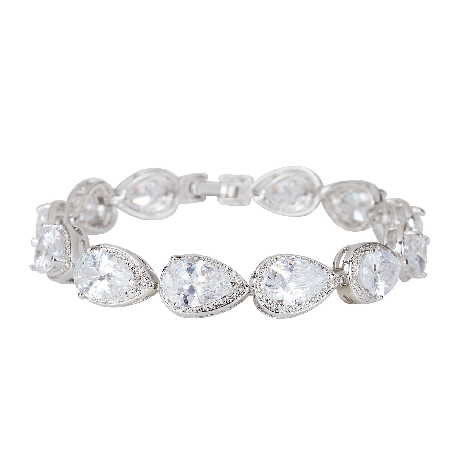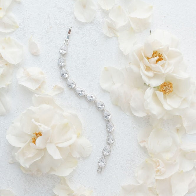 This bracelet is fabulous for brides, bridesmaids or other members of the bridal party. Featuring tear drop shaped cubic zirconia stones with a dotted silver border.