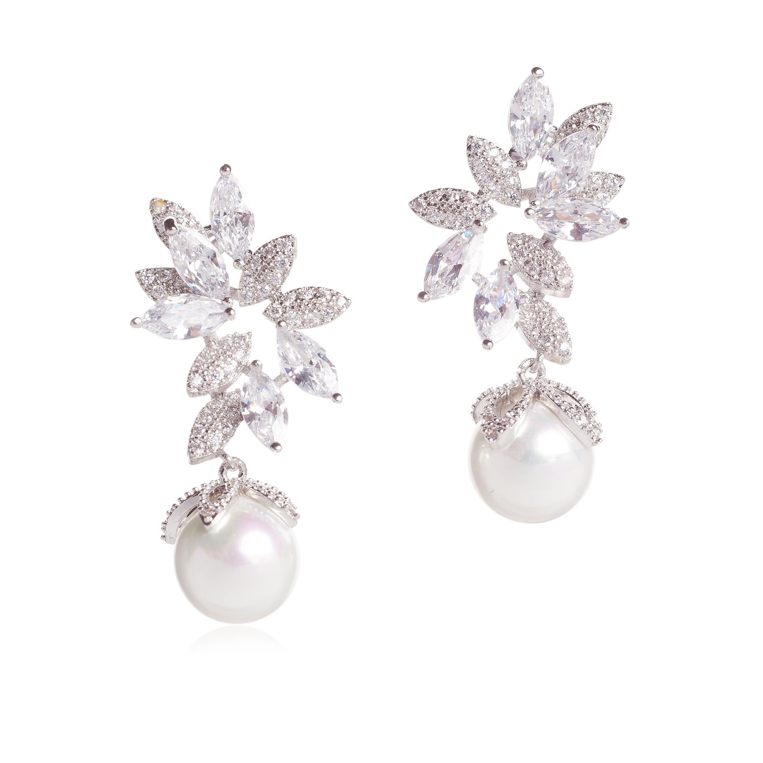 A unique pearl and cubic zirconia earring, complete with micro pave setting and marquis (diamond) shaped stones.