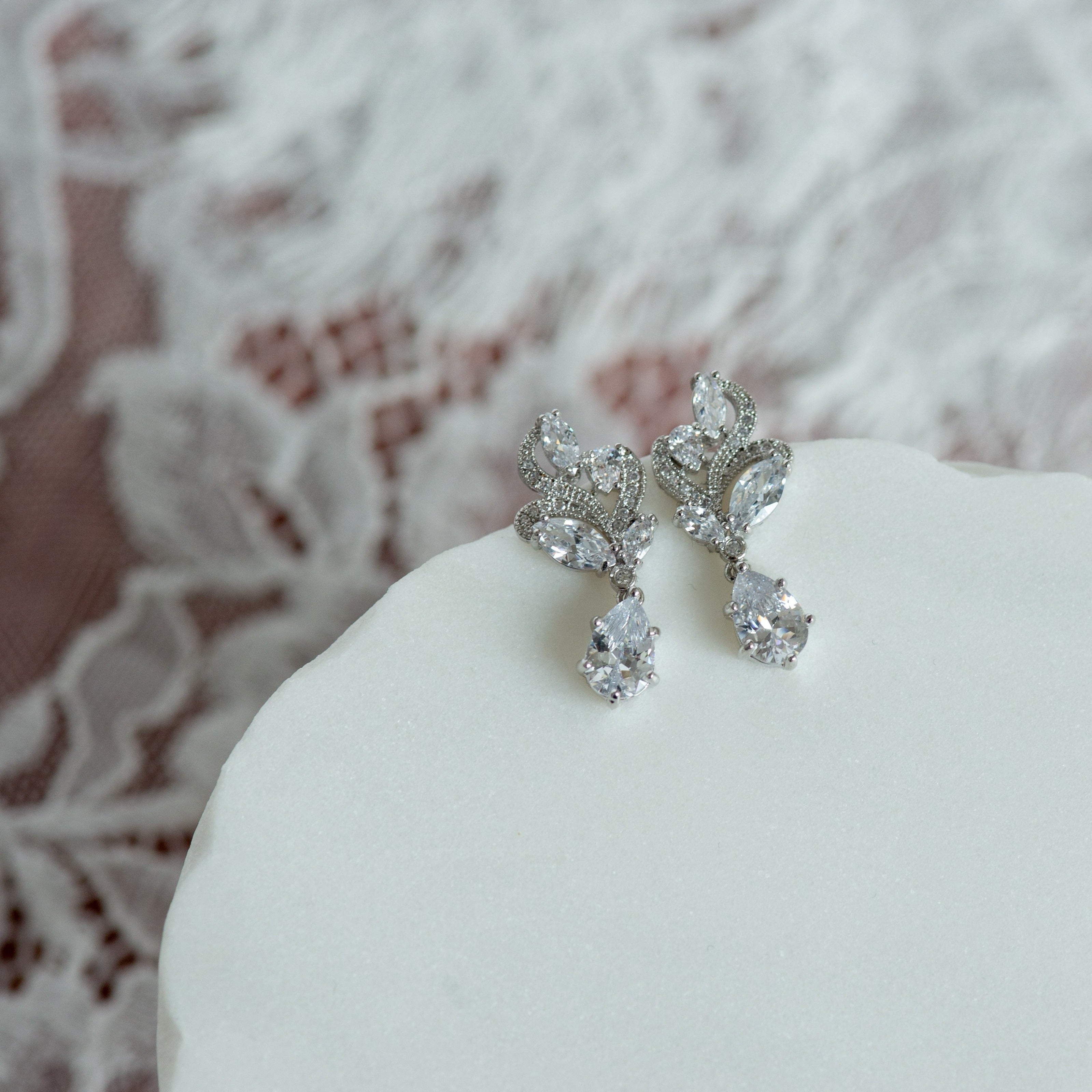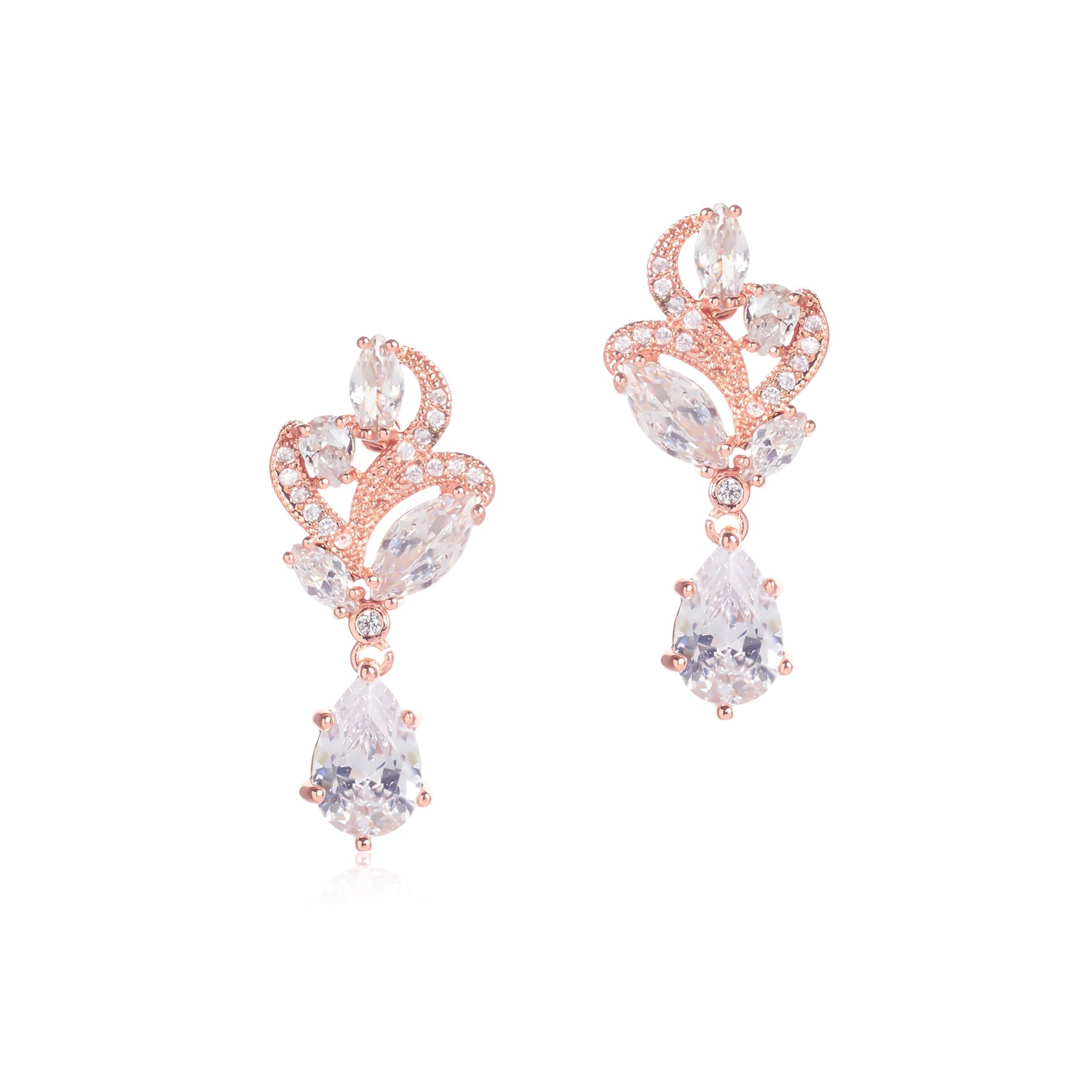 Both unique and glamorous! These sparkling earrings feature a gorgeous pear cut drops adorned with sparkling petite cubic zirconia gemstones and marquise and teardrop cuts.