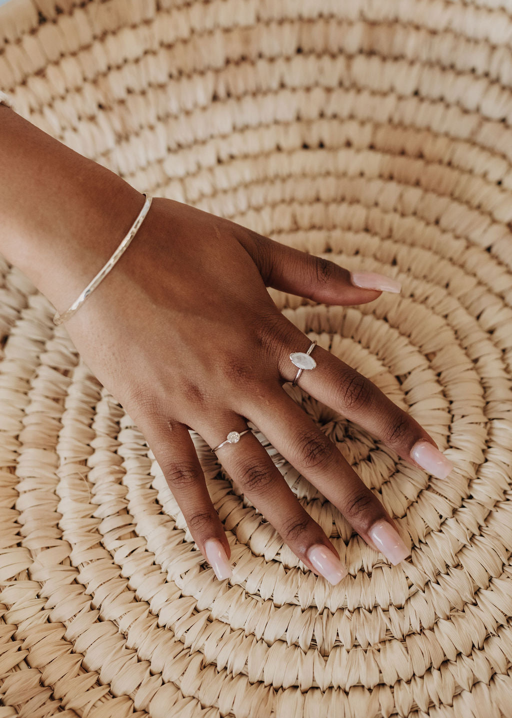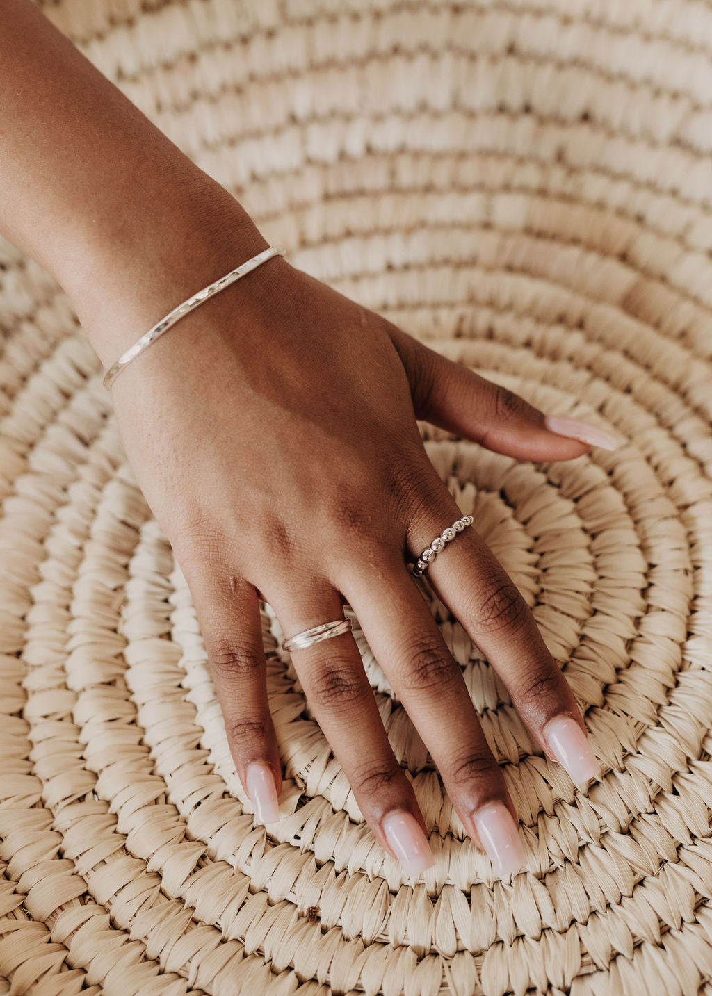 The hammered finish on the Alexandria cuff adds dimension and interest to the otherwise smooth version. Reflecting light in each movement, the hammered Alexandria offers a polished and sophisticated looking stack. Elevate your arm party! Lightly adjustable to fit most sizes