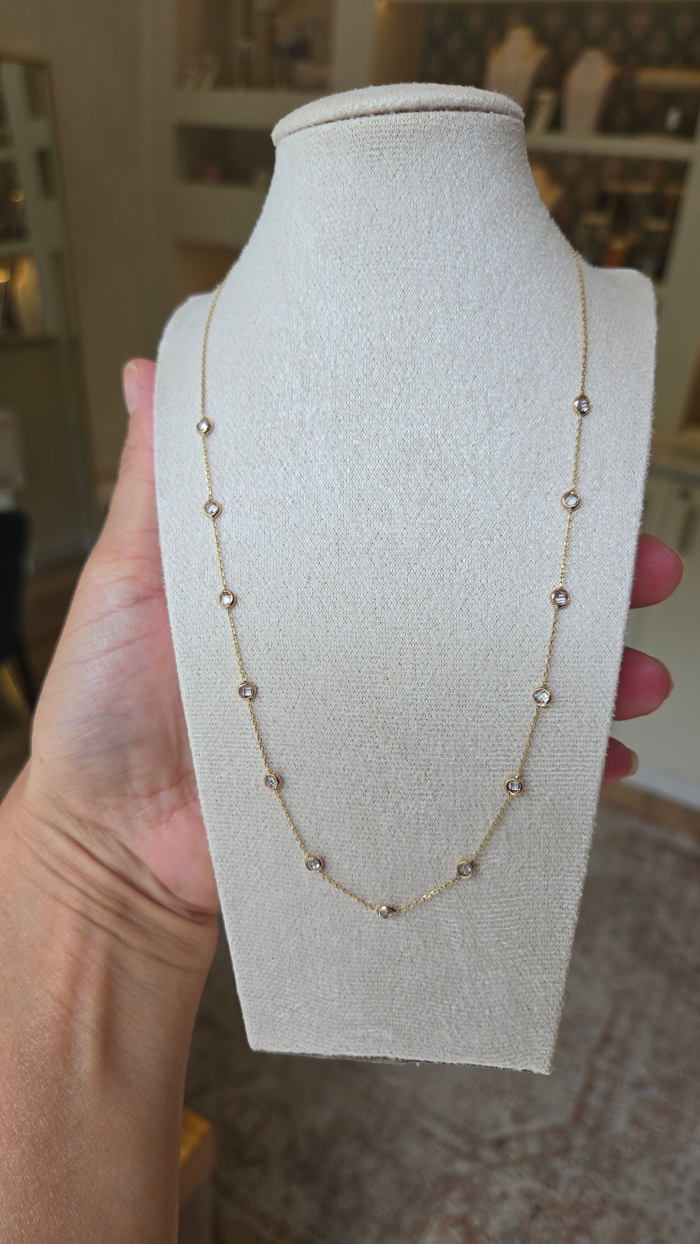 Our 10k gold CZ Station Necklace features brilliant cubic zirconia stones set along a sleek gold chain for just the right touch of shine. Perfect for layering or wearing solo, it’s a timeless essential for effortless elegance.