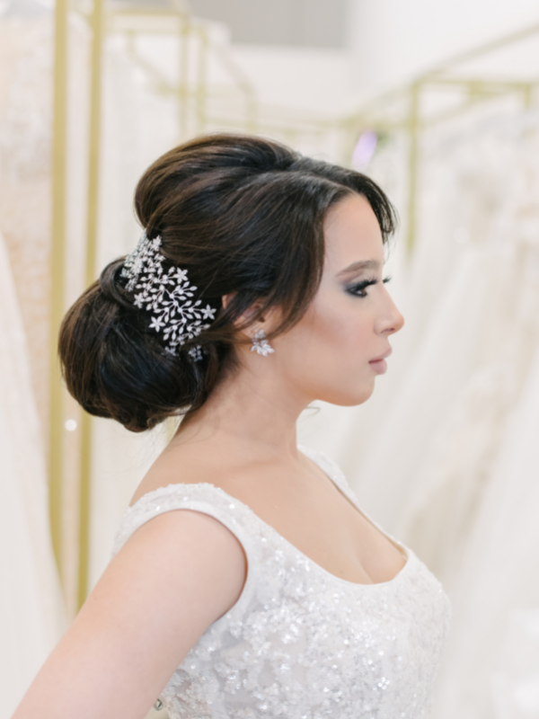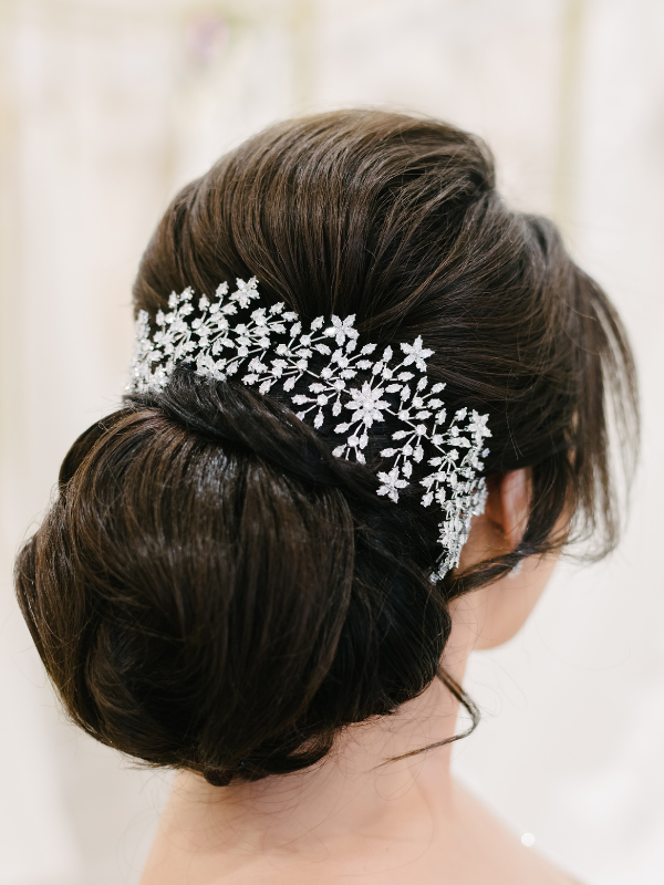 Featured on a gorgeous low bun, it effortlessly wraps around to create the most elegant look.