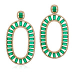 Elegance and luxury at its finest! These earrings will be the envy of them all. Emerald color baguette stones line the oval shaped frame, complete with micro pave cubic border.