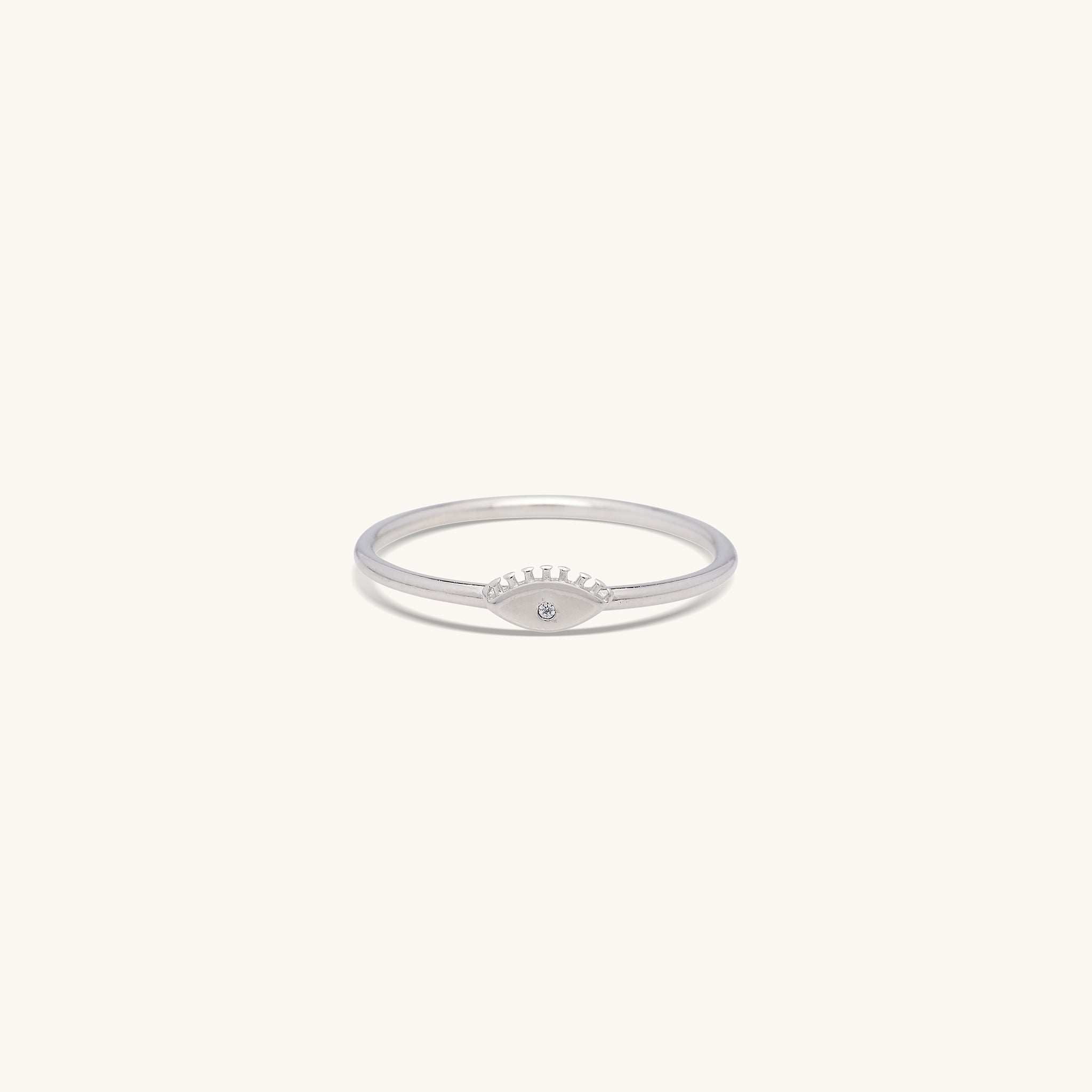 A dainty evil eye ring, with a classic shaped eye and lashes featuring a cubic zirconia stone. This piece is not only great on its own, but can be stacked with any of your favorite rings