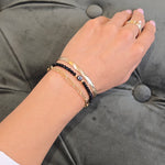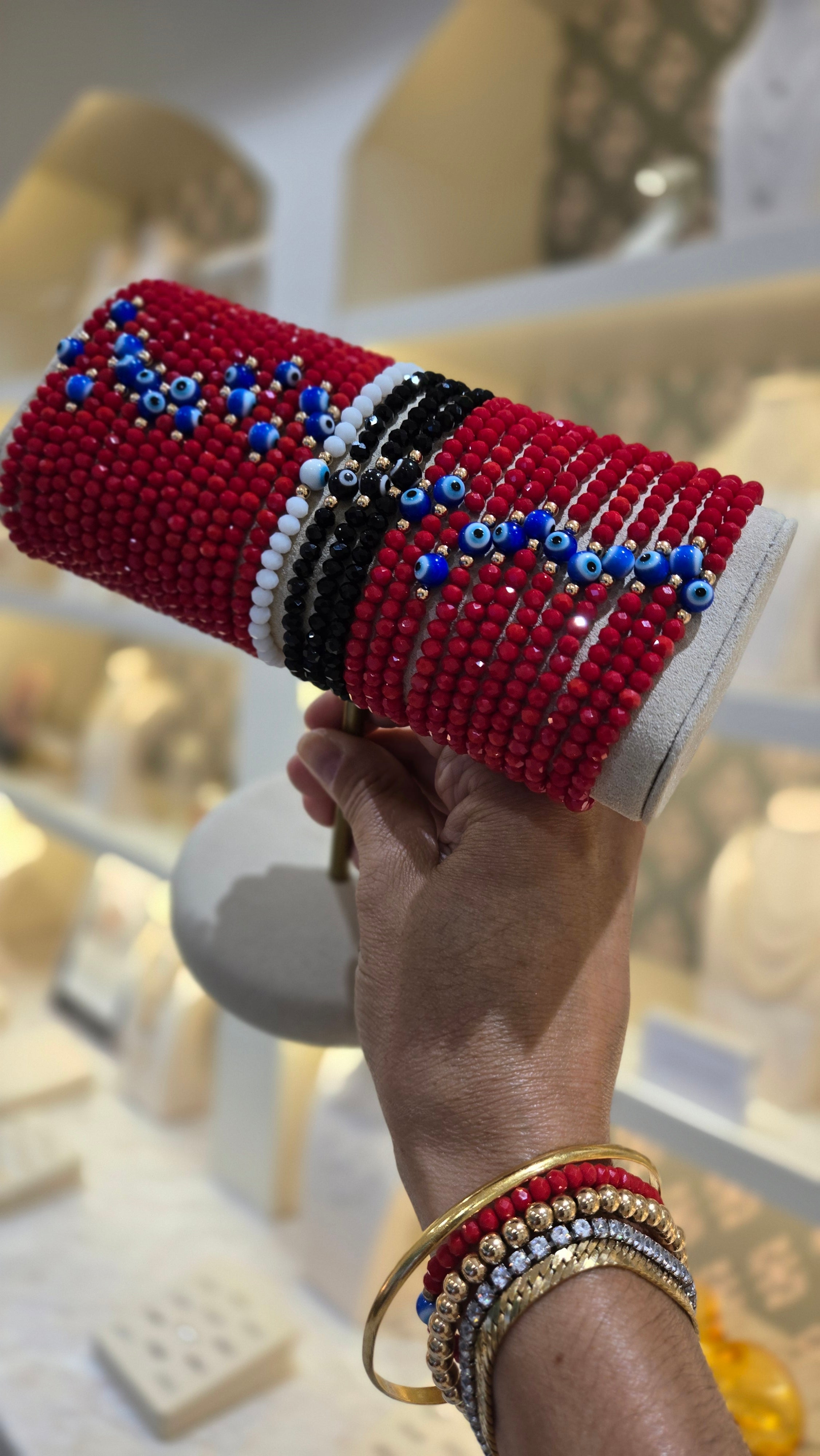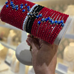 I love these bracelets I have the red, white and would like to get the black one. Crystal beads sparkle perfectly and look expensive. If you could make a gold version that would be amazing! They pair nicely with other bracelets and bangles too!