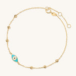 Featuring a beautiful turquoise 10k solid gold eye with gold studded beads.