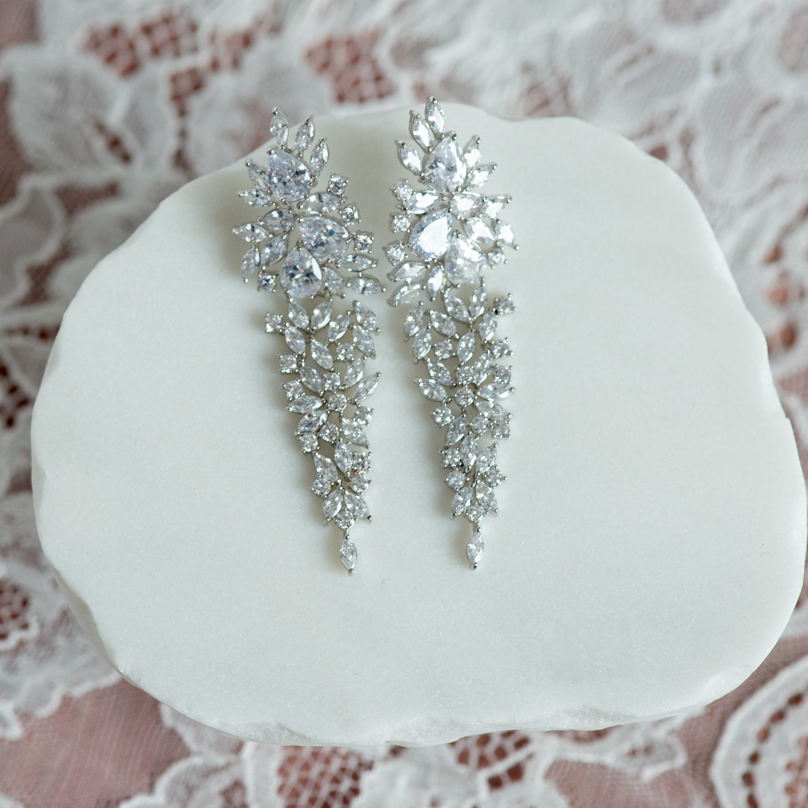 These earrings are definitely going to make a statement. They have a combination of pear, marquise and round shaped cubic zirconia stones