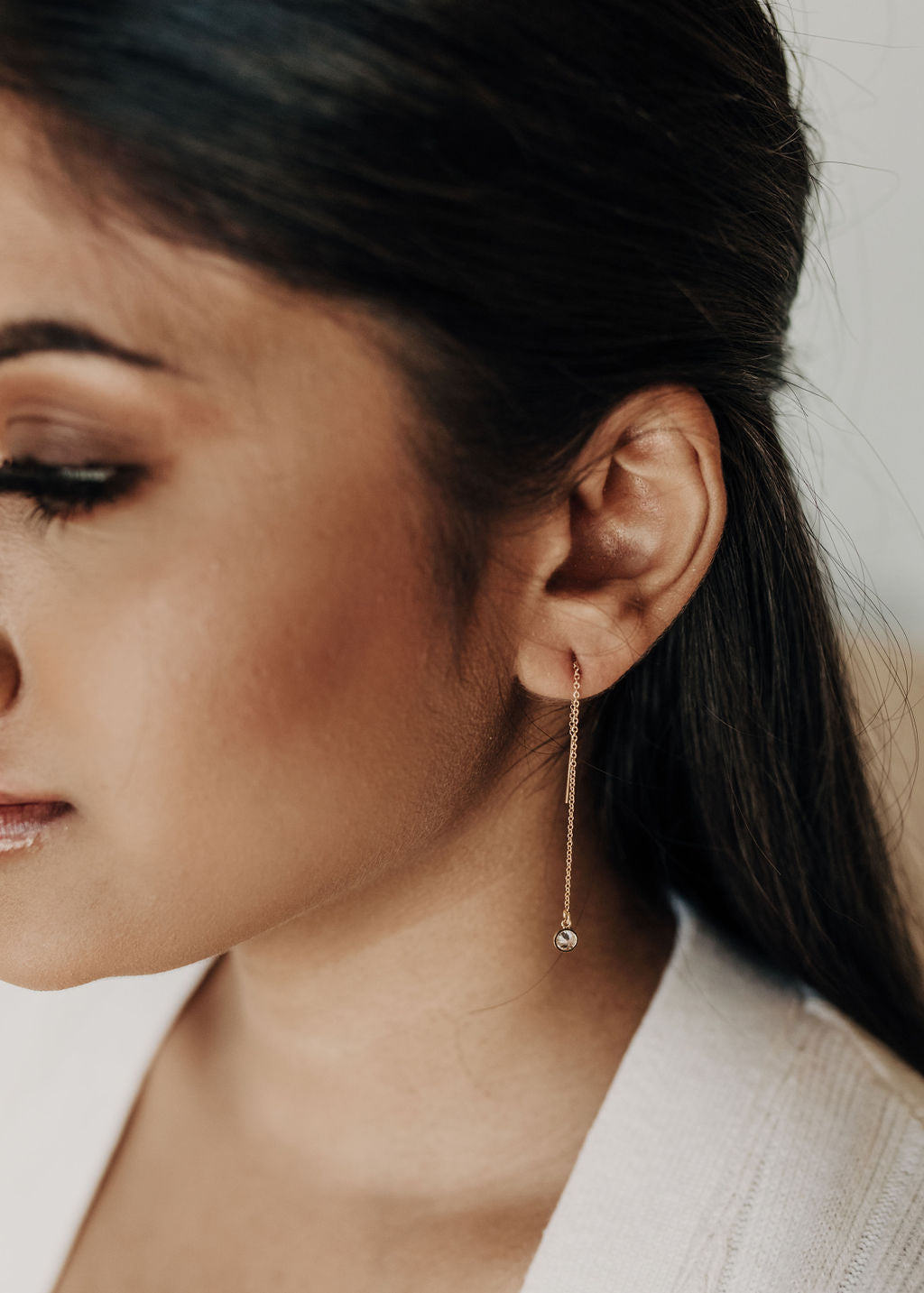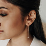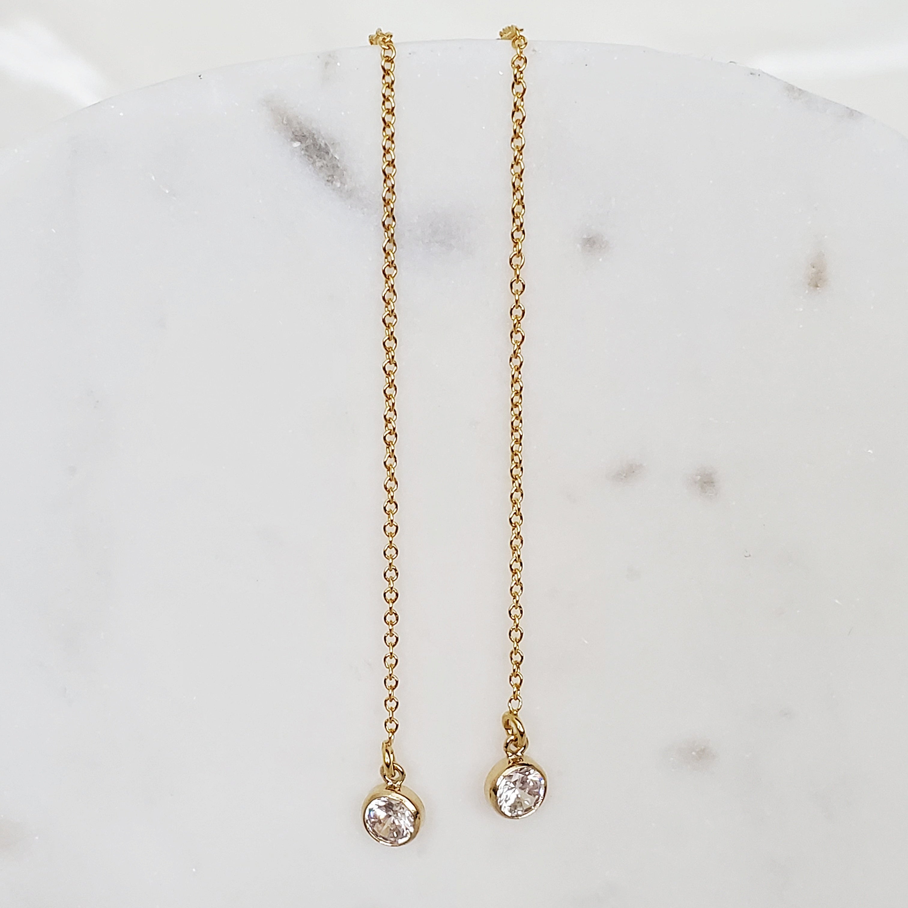 These fabulous earrings are composed of a gold filled link chain. It can be worn by threading the earring through your ear lobe and allowing it to dangle. If you have multiple holes, it can be threaded through both to create a unique look