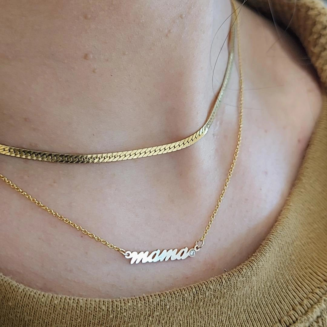 Cursive “mama” nameplate with a dainty cubic zirconia accent