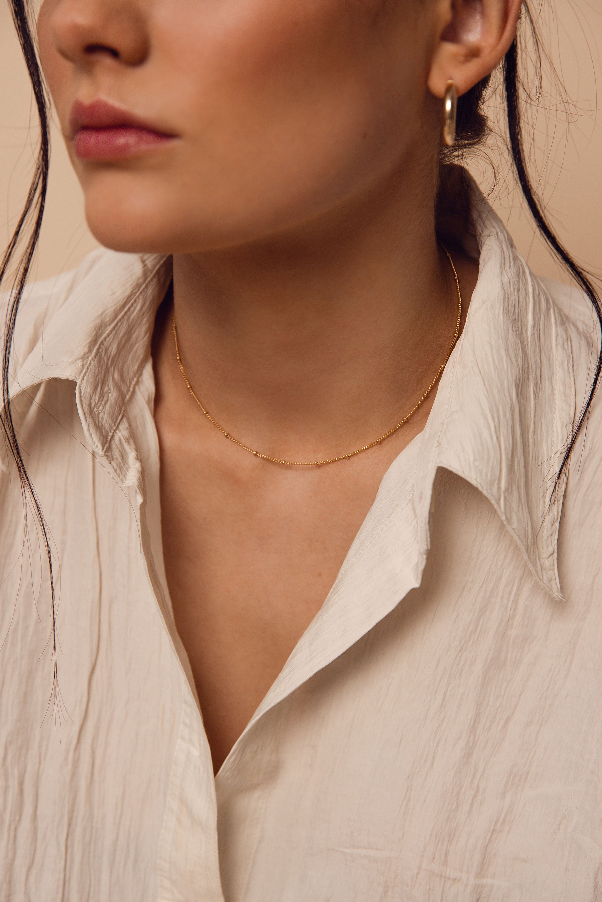 A new chain style in the Olaeda family! The most requested satellite chain is finally here. And, it's available in a choker and necklace length. Cheers to new beginnings.