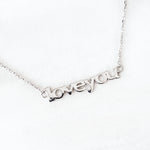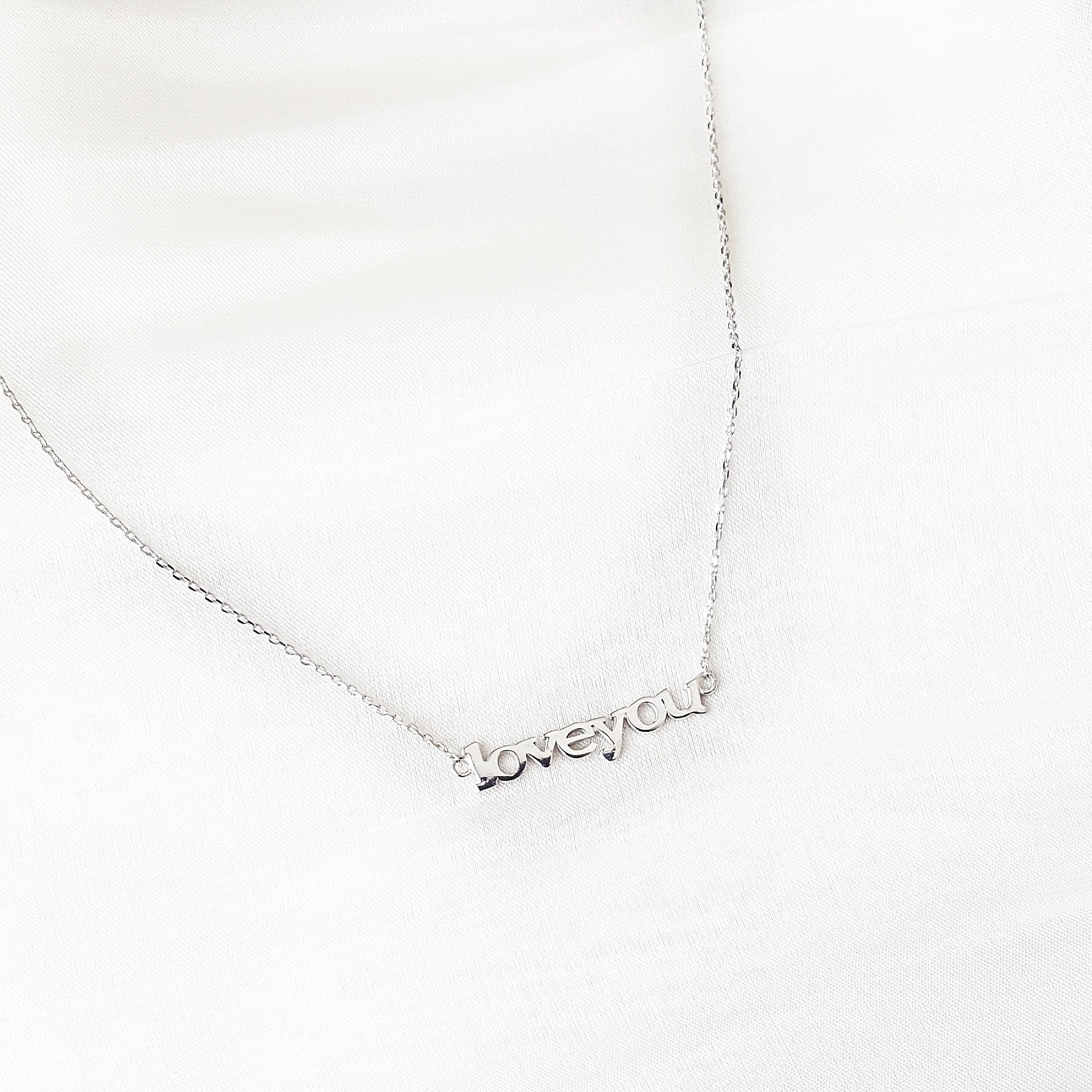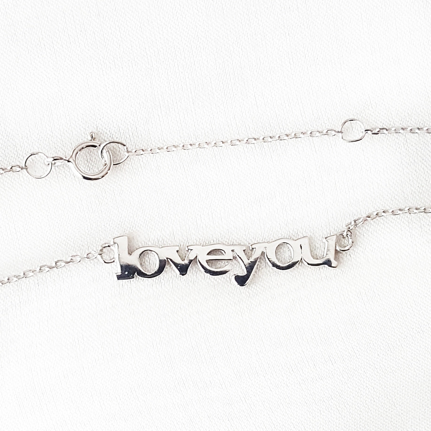 Such a simple and classy sterling silver necklace with the word "Loveyou" written.