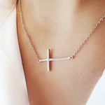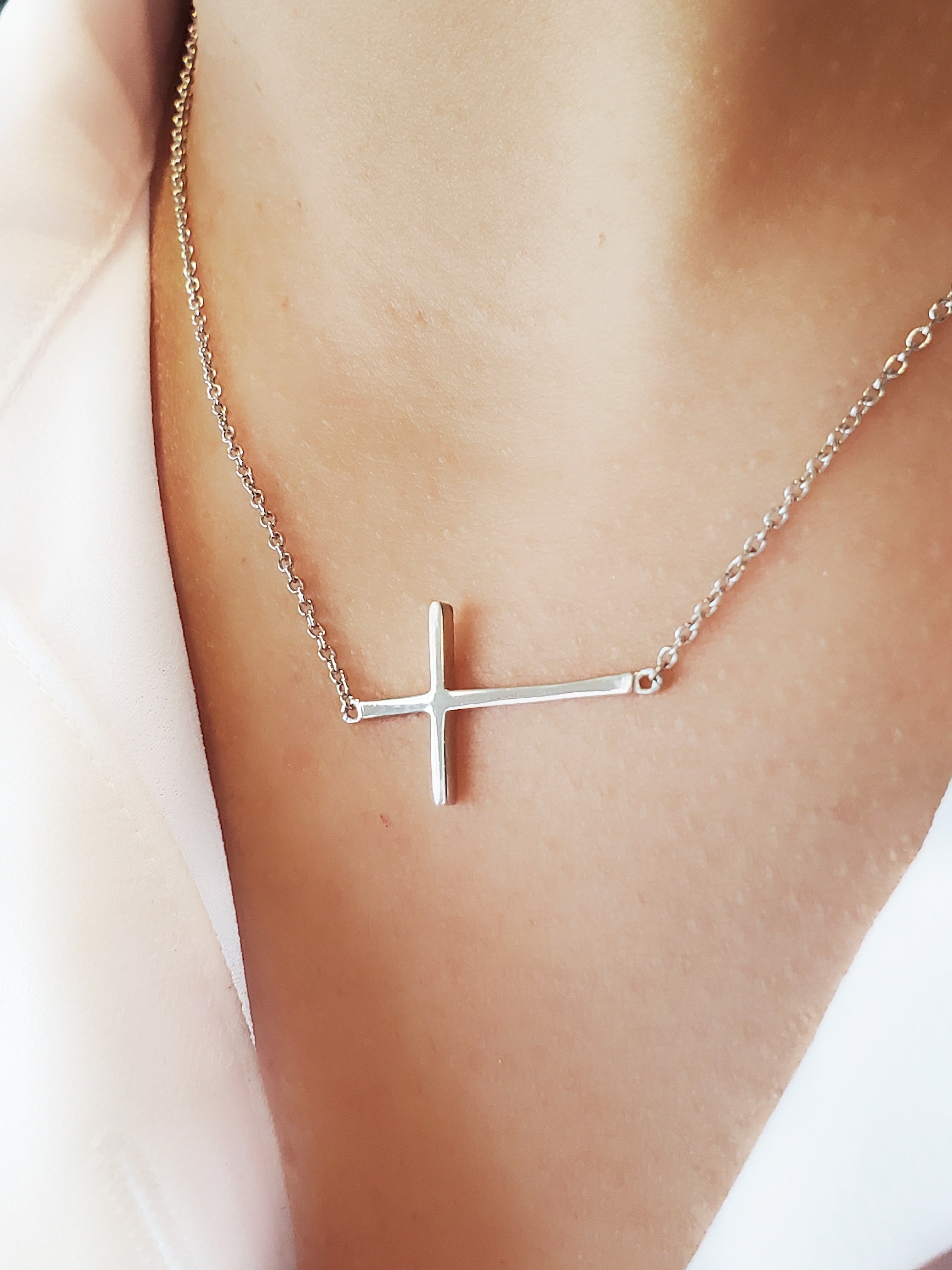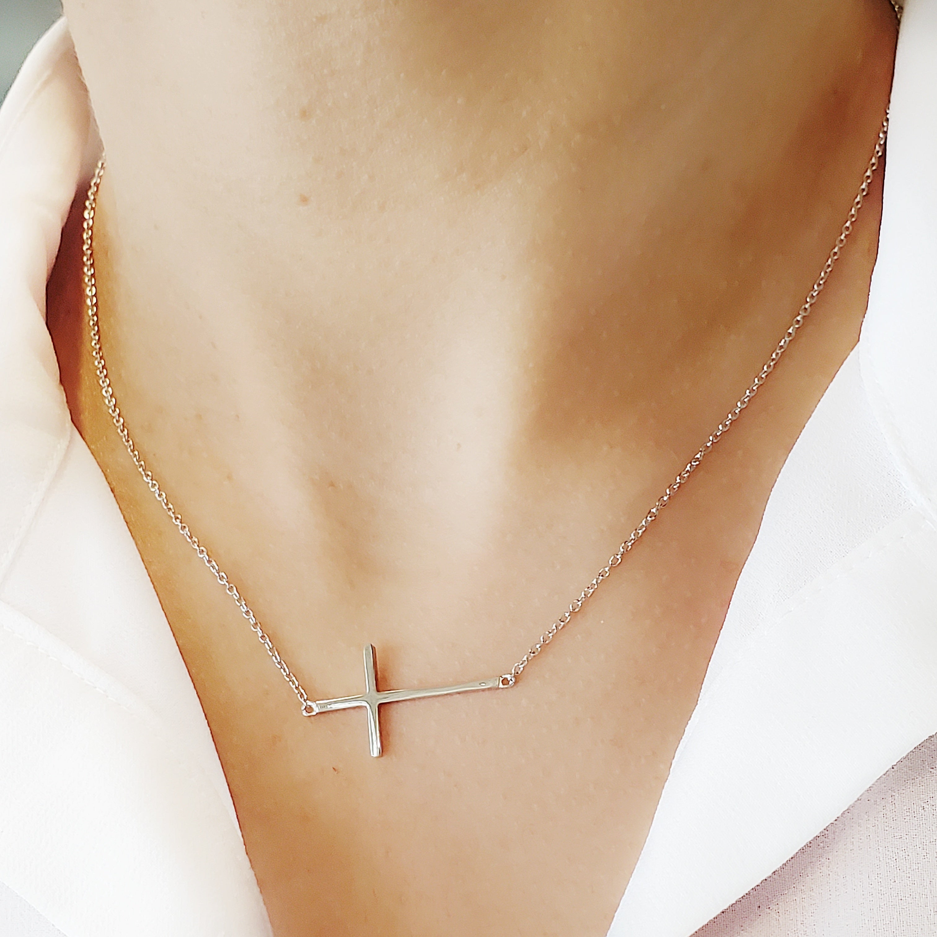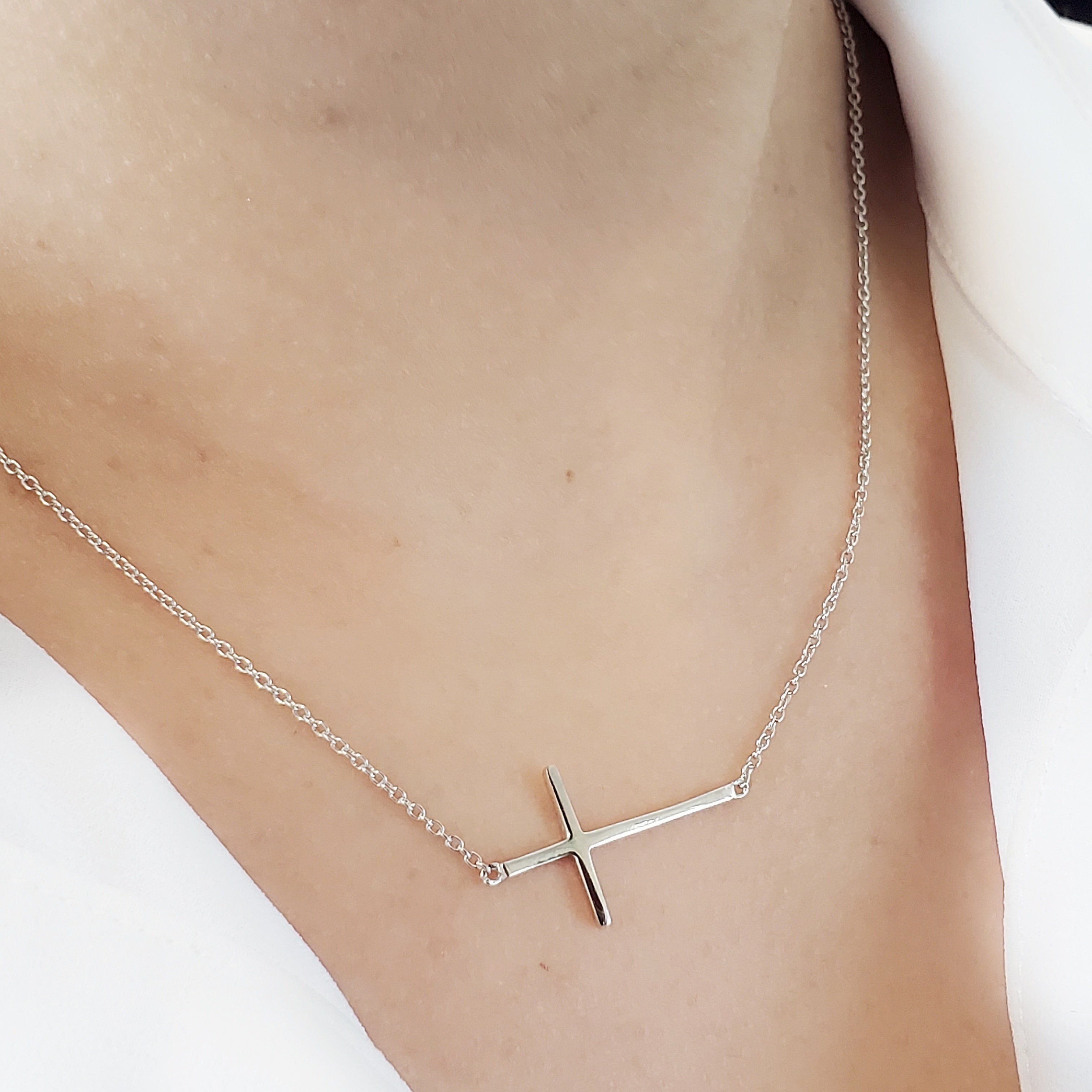 This simple and dainty sideways cross is a wonderful staple piece. It's made from sterling silver and can be worn at either 16 or 18 inches in length (adjustable)