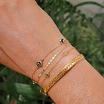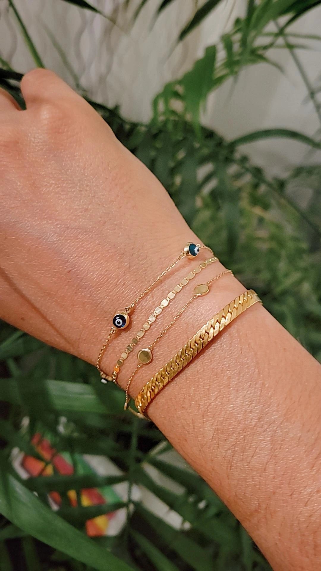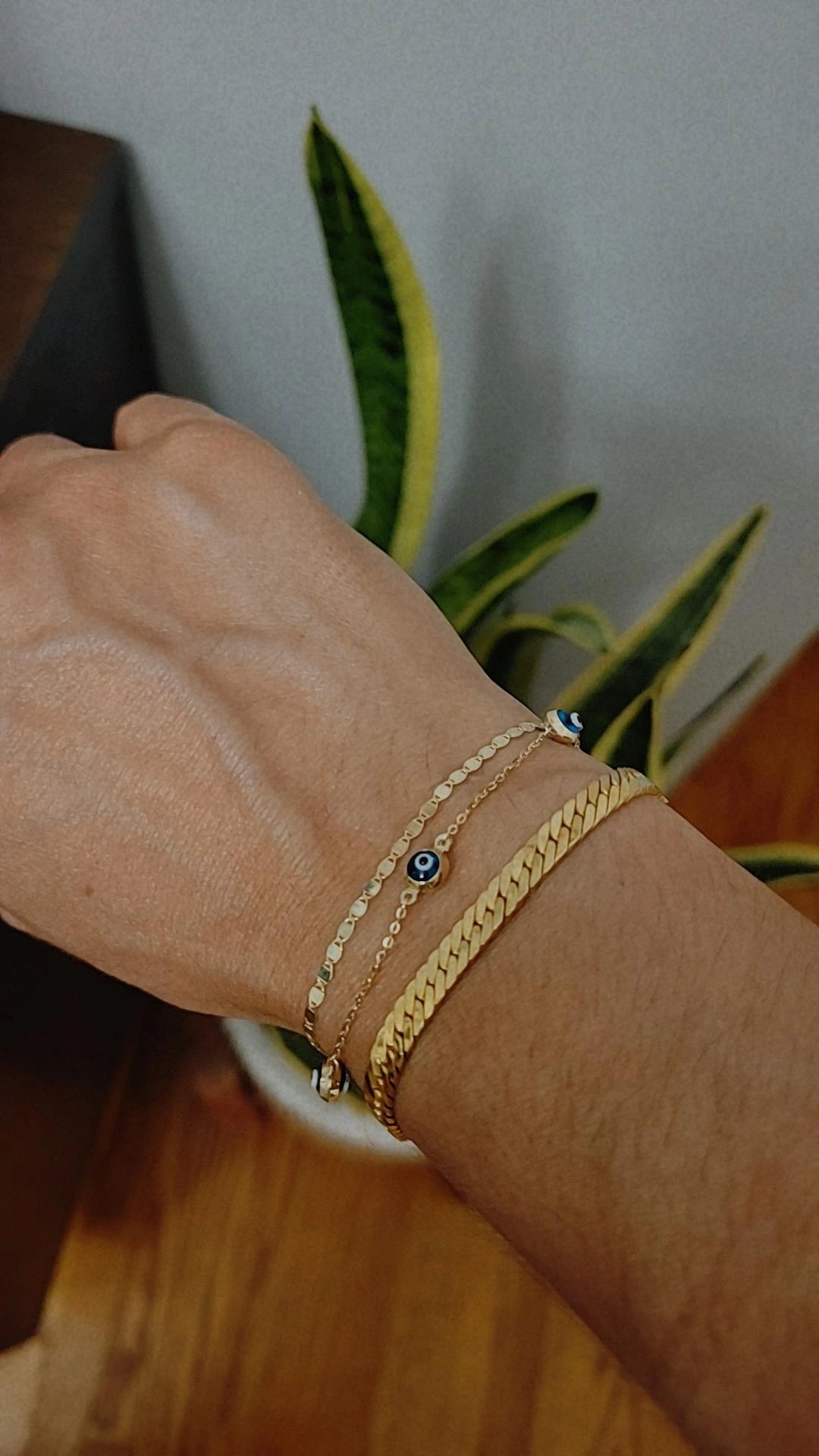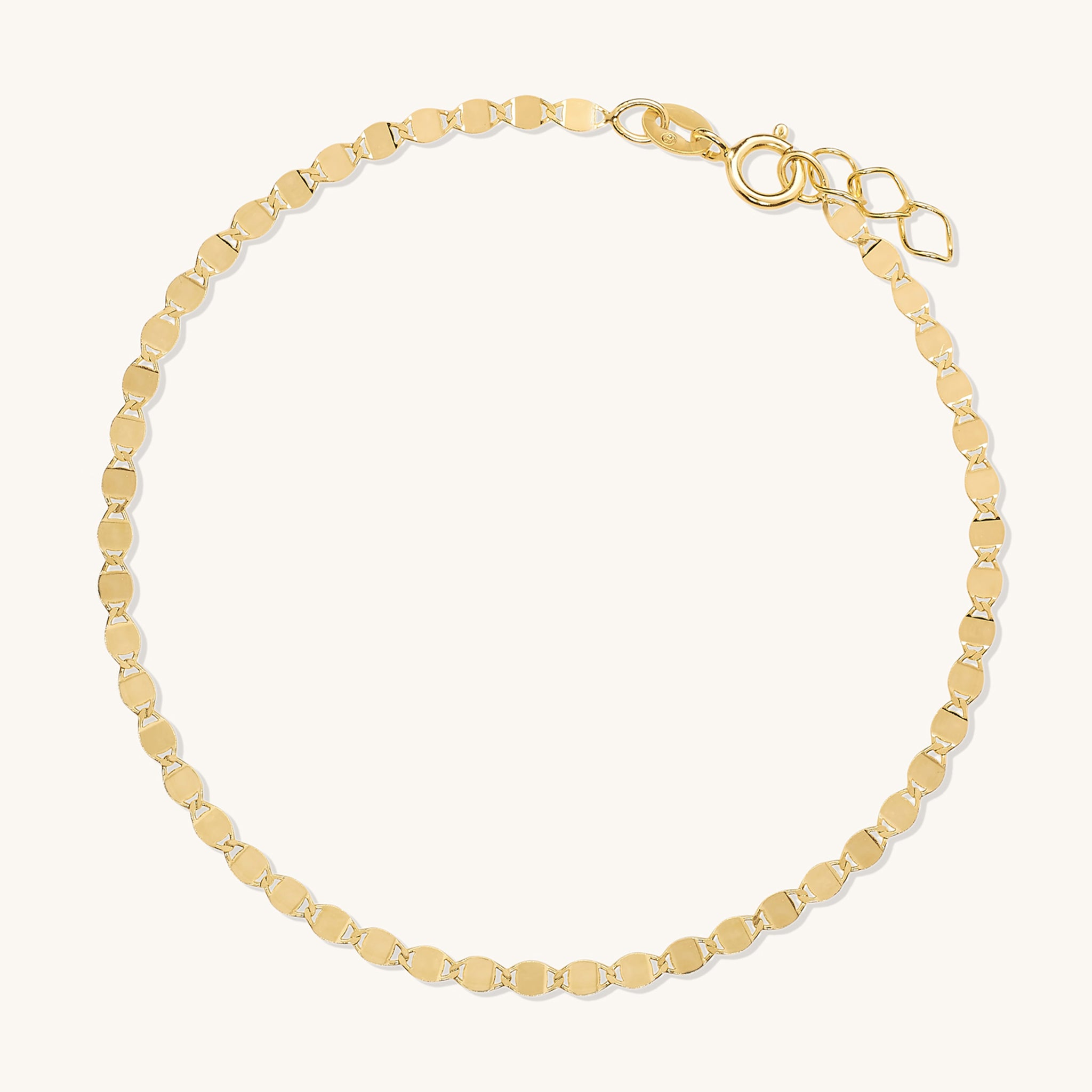 This shimmery chain sparkles and shines with every movement. A unique and delicate chain makes a beautiful addition to your arm party! It can be worn solo or styled with your favorite wrist stack. The bracelet is adjustable from 6.5 inches to 7.0 inches. Made in Italy