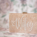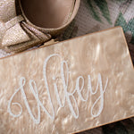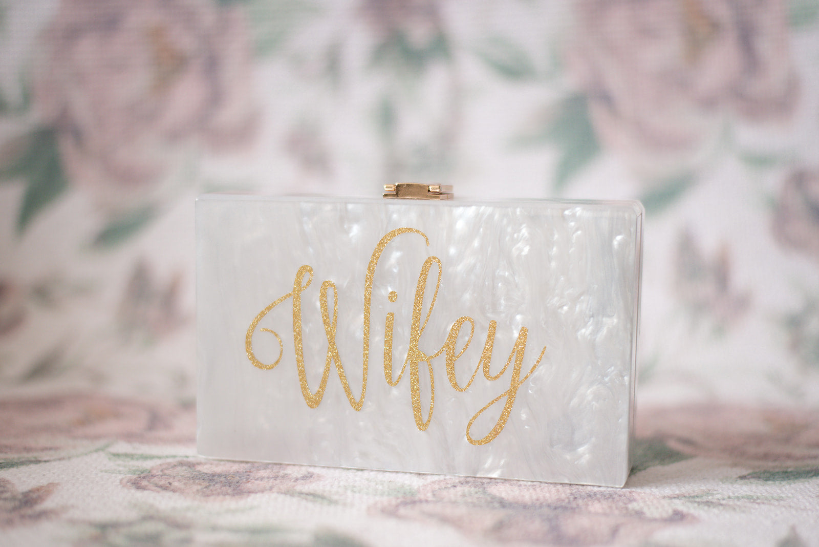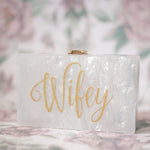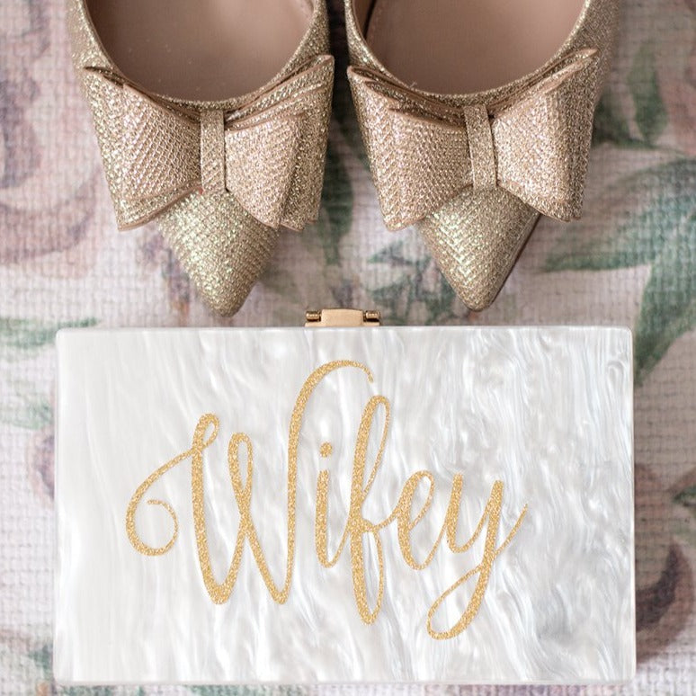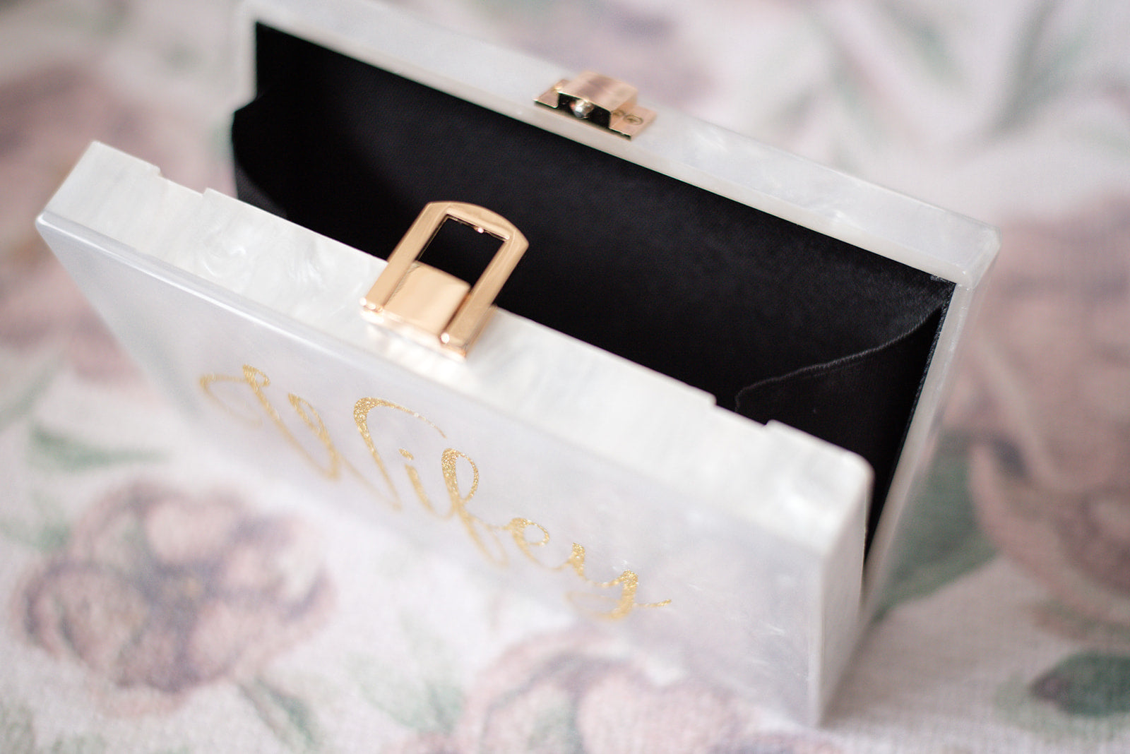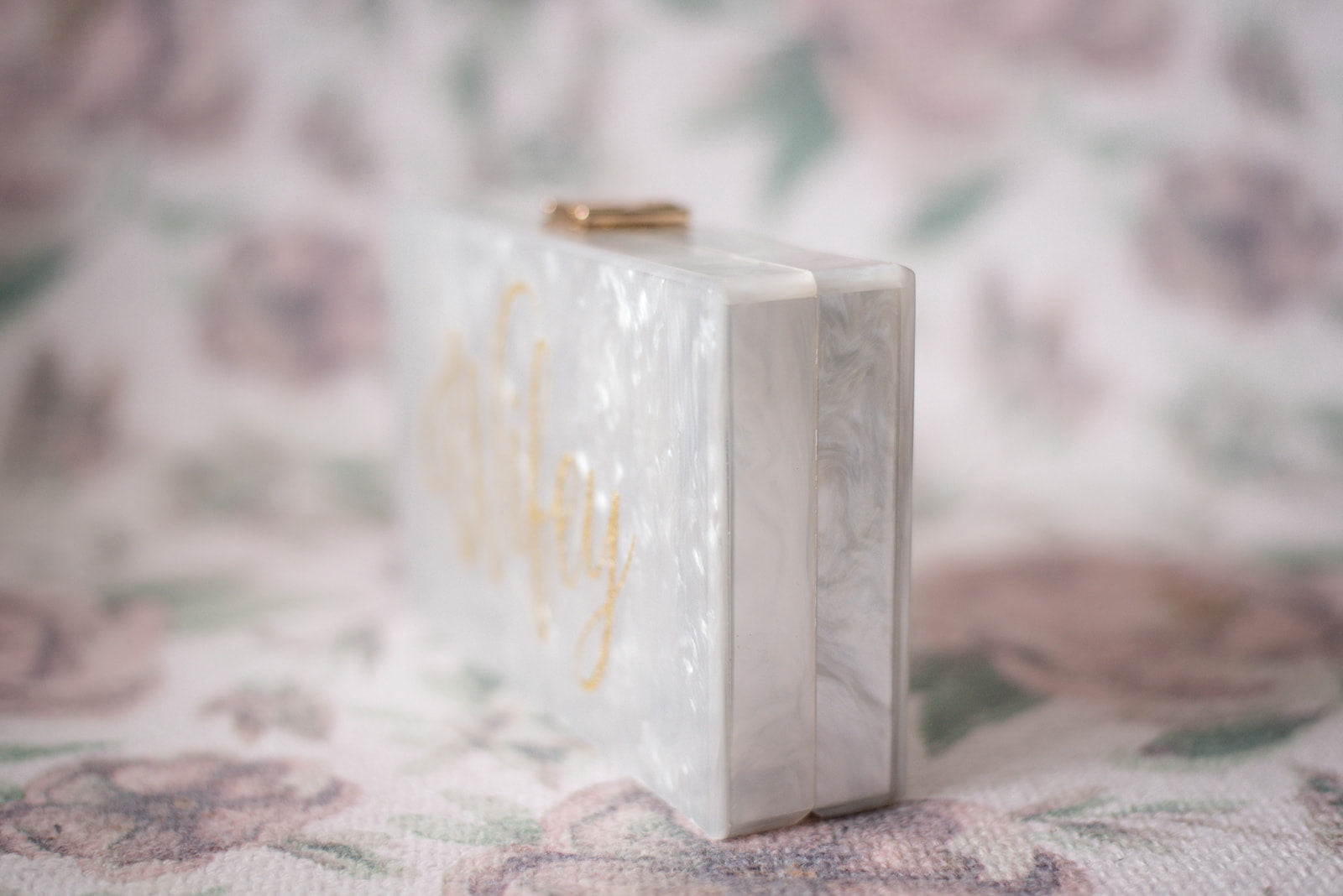 Accessories by Talia exclusive pearlescent box clutch with speckled script text and gold hardware
