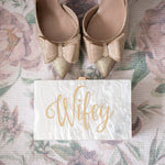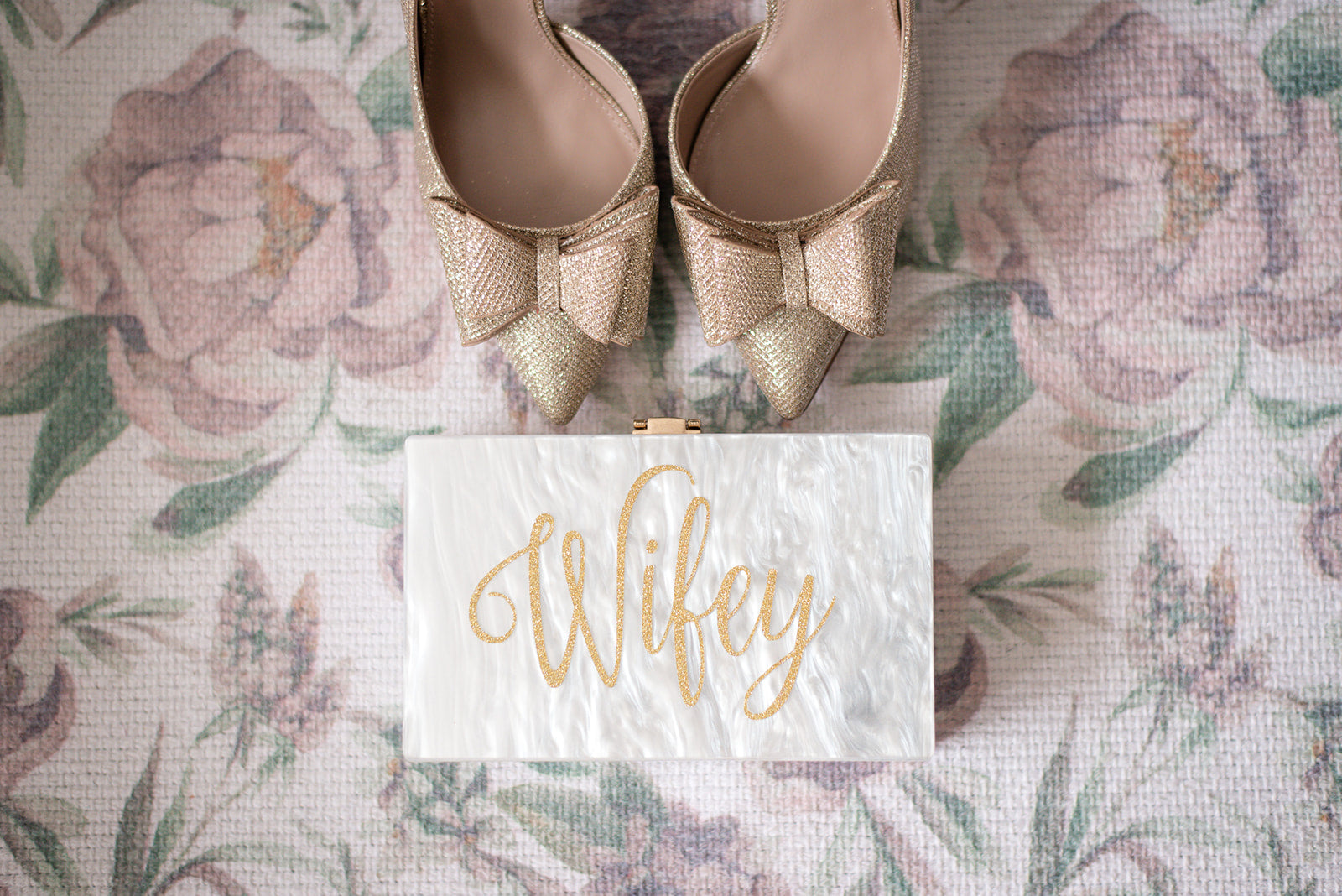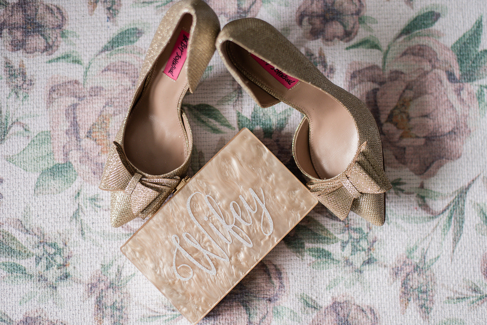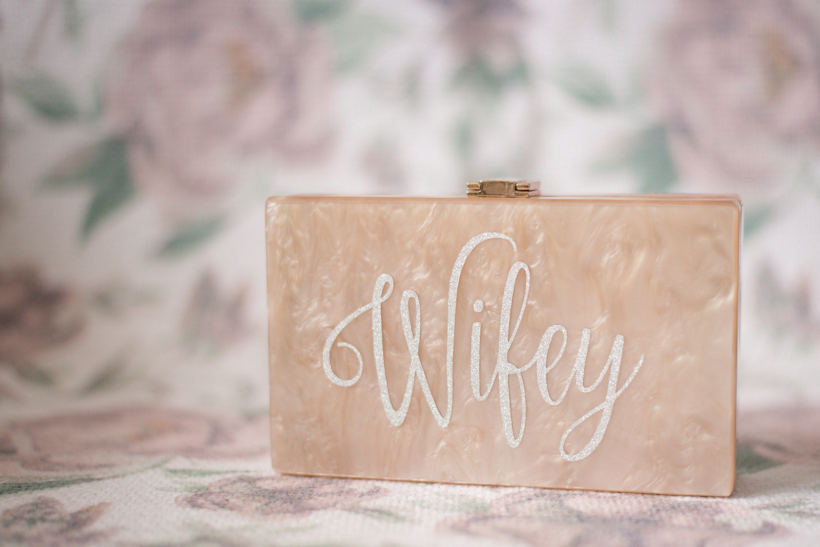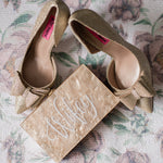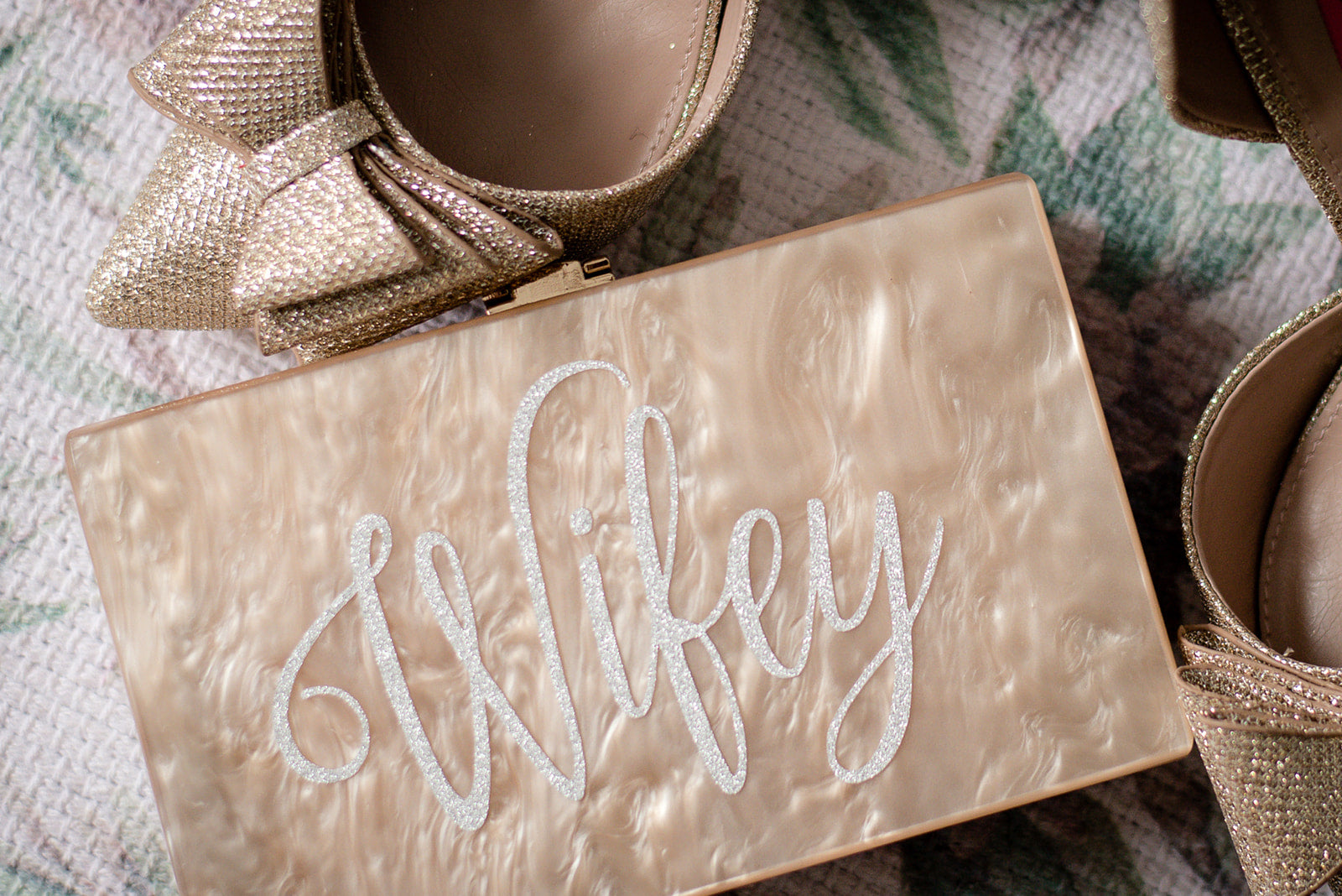 Accessories by Talia exclusive pearlescent box clutch with speckled script text and gold hardware